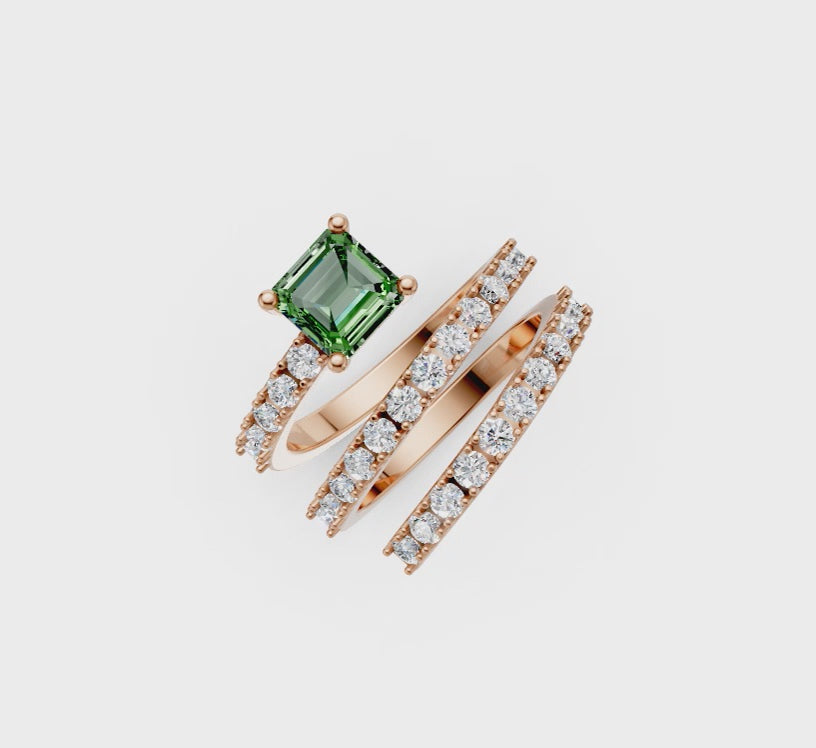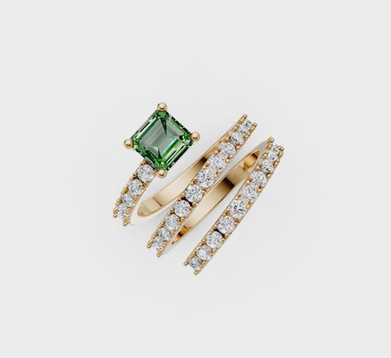 The Lineage Spiral Ring in 18kt gold, natural white diamonds and green tourmaline.